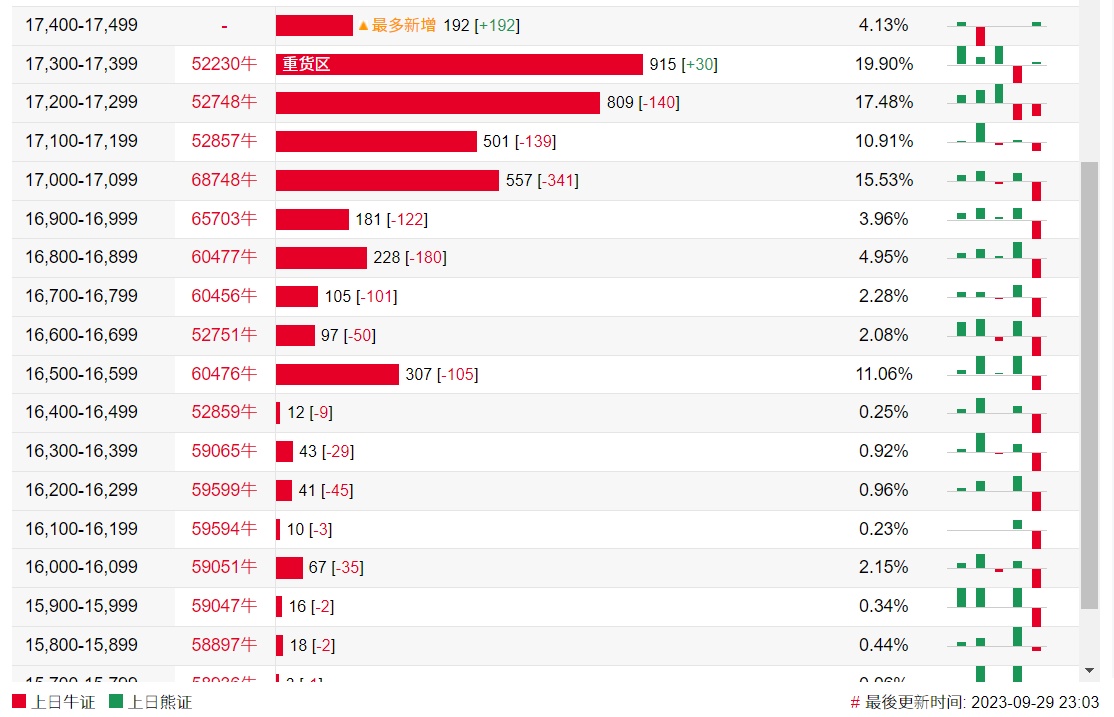 牛证街货重货区在17300-17399区间,该区间最新牛证数量为915张,较上一交易日增加30张。最多新增在17400-17499区间,该区间最新牛证数量为192张,较上一交易日增加192张。