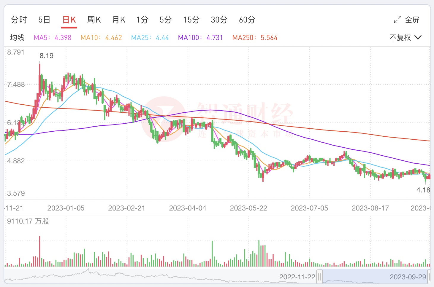 除了业绩,玖龙纸业的股价也承压明显。智通财经APP观测到,自去年12月创下近年以来的高位水平后,玖龙纸业便一直处于震荡下行之势中。9月27日公司股价更是跌至4.18港元的年内低位,相较于8.19港元的高位水平,公司股价几近腰斩。