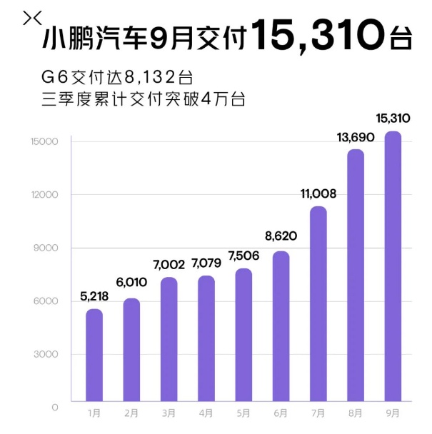 智通财经APP获悉,10月1日,小鹏汽车-W(09868)公布最新交付成绩。2023年9月小鹏汽车共交付新车15310台,环比增长12%,同比增长81%,连续8个月保持强劲增长,其中小鹏G6交付量达8132台,累计交付量达19381台。截至2023年9月30日,小鹏汽车三季度累计交付量达40008台,环比增长72%。
