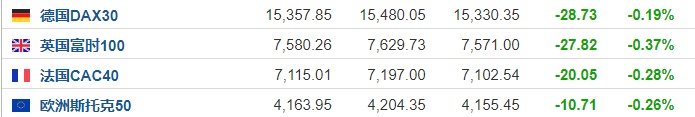 2.截至发稿,德国DAX指数跌0.19%,英国富时100指数跌0.37%,法国CAC40指数跌0.28%,欧洲斯托克50指数跌0.26%。