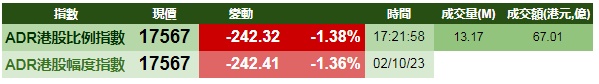智通财经APP获悉,周五美股三大指数涨跌不一,港股ADR指数下跌,按比例计算,收报17567点,较香港收市跌242.32点或1.38%。