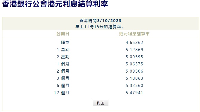智通财经APP获悉,季结和国庆假期过后,港元拆息全线向下。香港银行公会数据显示,隔夜、1星期及2星期拆息均连跌两日,齐创两星期新低。其中,隔夜拆息跌近103点子,报4.65262%;1星期拆息跌约62点子,报5.12869%;2星期拆息跌逾48点子,报5.09595%。与楼按相关的1个月拆息跌逾33点子,报5.06375%,连跌两日,创逾两星期新低。反映银行资金成本的3个月拆息降5.18863%。长息方面,6个月及1年期拆息均结束6日升势,分别跌逾6点子及近3点子,降至5.3256%及5.47941%。