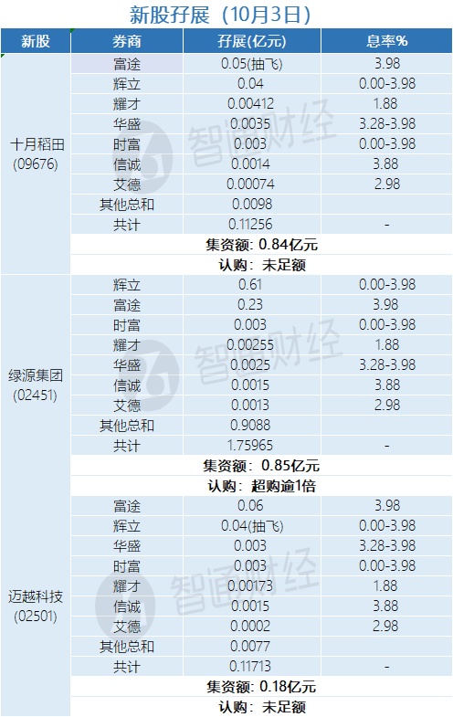 智通财经APP获悉,十月稻田(09676)、绿源集团(02451)、迈越科技(02501)正在招股中。截至10月3日,富途、华盛等券商为绿源集团借出孖展1.75965亿港元,超购逾1倍。
