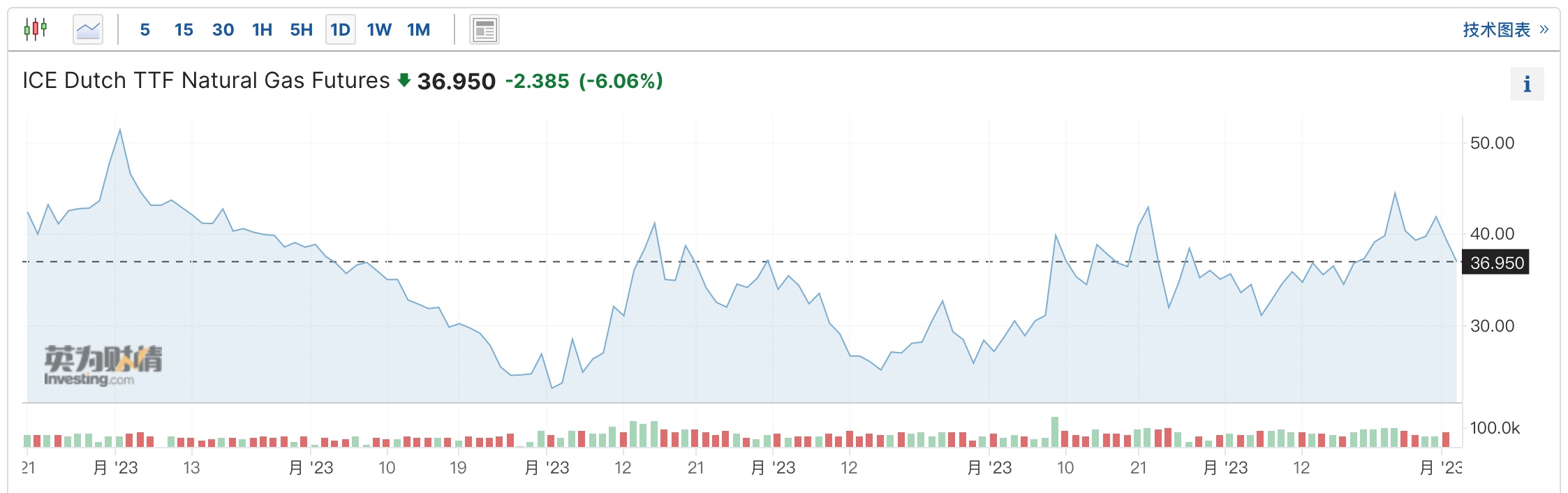 智通财经APP获悉,由于异常温暖的天气破坏了本已因工业需求疲软而受到打击的天然气需求,欧洲天然气价格大幅走低。数据显示,继周一跌超6%之后,截至发稿,基准荷兰TTF天然气期货价格周二再跌逾6%,至36.95欧元/兆瓦时;日内早些时候一度跌7.5%,并触及2017年有记录以来的最低水平。