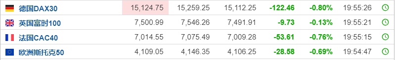 2. 截至发稿,德国DAX指数跌0.80%,英国富时100指数跌0.13%,法国CAC40指数跌0.76%,欧洲斯托克50指数跌0.69%。
