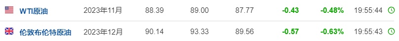 3. 截至发稿,WTI原油跌0.48%,报88.39美元/桶。布伦特原油跌0.63%,报90.14美元/桶。