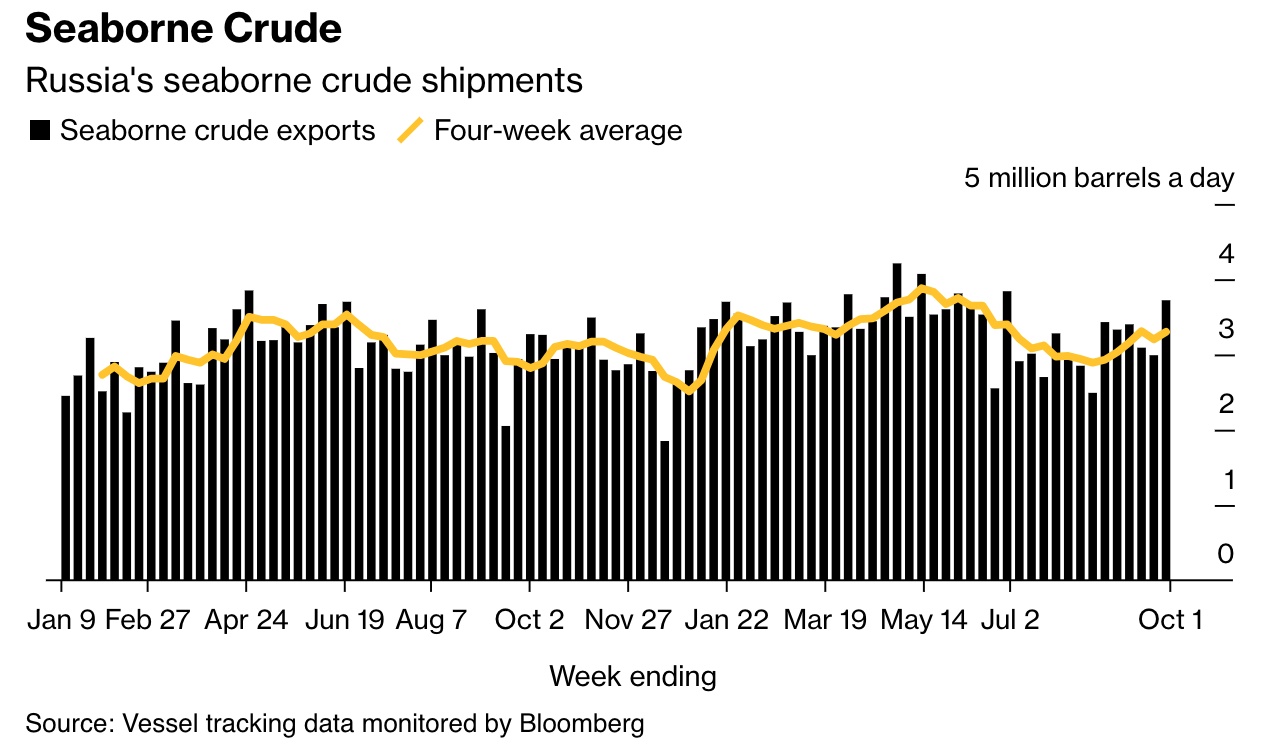智通财经APP获悉,数据显示,在截至10月1日的一周内,俄罗斯海运原油出货量约为372万桶/日,较上一周增加了24%,升至三个月以来的最高水平。此外,在截至10月1日的过去四周,俄罗斯海运原油平均出货量也升至约330万桶/日。此前几周,维修工作导致太平洋沿岸的Kozmino和波罗的海沿岸的Primorsk这两个主要港口的海运原油出口受到限制。