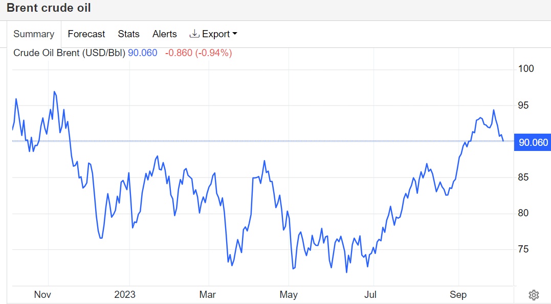 但此后油价上涨势头有所降温,布伦特原油期货本周回落至每桶90美元附近。有迹象显示,国际原油价格刺激下,汽油等成品油飙升趋势正促使美联储等央行在更长时间内维持较高利率。华尔街大行摩根大通表示,由于燃料成本挤压消费者,需求破坏这一趋势可能已经开始蔓延。