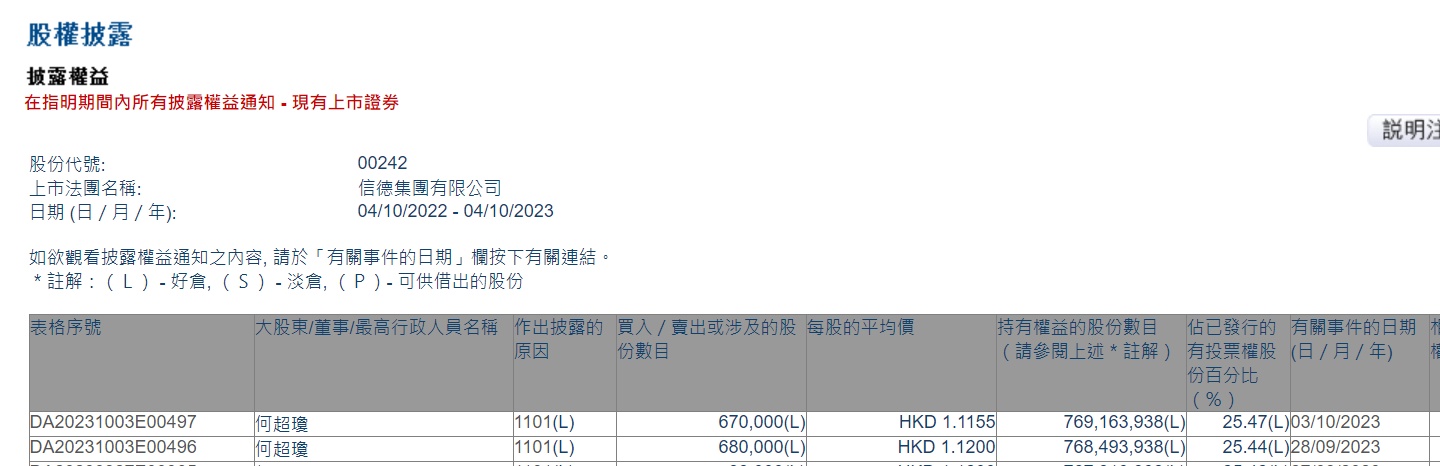 智通财经APP获悉,香港联交所最新资料显示,9月28日、10月3日,主席兼董事总经理何超琼分别增持信德集团(00242)68万股、67万股,合计135万股;每股作价分别为1.12港元、1.1155港元;总金额约为150.90万港元。增持后最新持股数目约为7.69亿股,最新持股比例为25.47%。