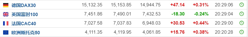 2. 截至发稿,德国DAX指数涨0.31%,英国富时100指数跌0.24%,法国CAC40指数涨0.44%,欧洲斯托克50指数涨0.38%。