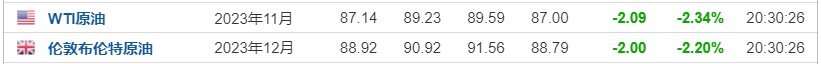 3. 截至发稿,WTI原油跌2.34%,报87.14美元/桶。布伦特原油跌2.20%,报88.92美元/桶。