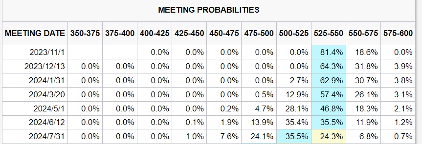 金融市场走势突然出现剧烈变动,主要因“小非农”数据公布后,美联储年底前再次加息的可能性下降。CME“美联储观察工具”显示,利率期货交易员们大幅降低了对于年内美联储加息的押注力度,普遍预期美联储已结束加息周期。要知道昨日JOLTs美国职位空缺数据公布后,交易员们对于11月和12月加息的押注陡升。但是,利率期货市场对于higher for longer的预期并未明显降温。