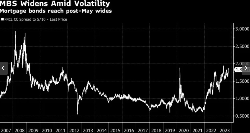 这种波动还波及到房地产市场和公司债券。而衡量欧洲次级投资级企业信贷风险的一项关键指标飙升至5月以来最高水平。其中,最值得关注的是美国8万亿美元的抵押贷款债券市场。一项关键指标显示,最近几周,由美国政府支持的住房贷款重新打包的抵押贷款支持证券(MBS)价格跌至历史最高水平。抛售已使这一资产类别接近今年5月创下的后金融危机时期的纪录。抵押贷款债券息差在30年期美国国债收益率达到2007年以来最高水平的基础上不断扩大,令那些希望长期收益率已经企稳而买入这些证券的投资者感到痛苦。抵押贷款债券收益率上升还可能推高购房者的抵押贷款利率。上周,购房者的抵押贷款利率自2000年以来首次超过7.5%。
