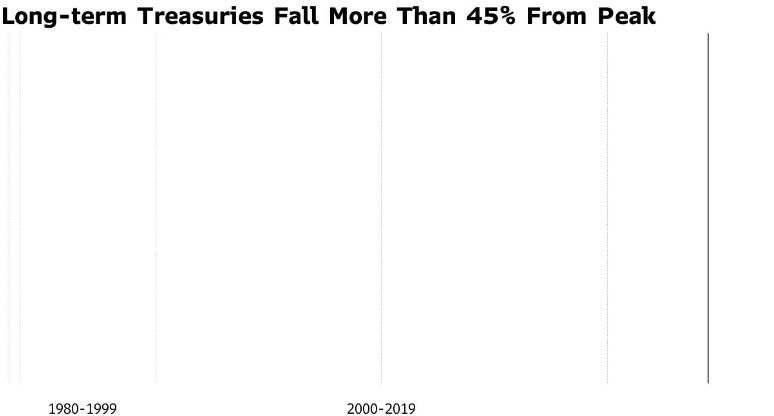 投资者遭受巨大痛苦的唯一最好例子可能是在2020年5月以1.25%利率发行的30年期美国国债的溃败。自发行以来,该债券的价值已经下跌了一半以上,交易价格约为45美分。