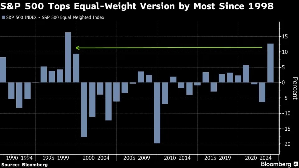尽管标普500指数自1月初以来仍上涨了10%以上,但该指数54%的成份股今年以来仍处于下跌状态,因为科技巨头的巨大影响力掩盖了公用事业和电信类股的疲软。2023年,市值加权标普500指数的表现比同等权重标普500指数高出近13个百分点。美股今年的绝大部分涨势主要是由受益于人工智能热潮的科技巨头所推动的。如果今年以现在的水平收盘,这将是自1998年互联网热潮以来最大的差距。