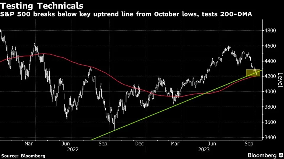 智通财经获悉,周三美国股市温和回升,但技术面显示,如果美股进一步大幅下跌,多头在未来几周可能会遭遇一些严重的痛苦,之后股指才会最终企稳。标普500指数本周突破了长达一年的上行趋势,现在技术指标观察人士表示,该指数需要保持在200日移动均线上方,目前为4204点左右。技术交易员使用移动平均线来评估长期趋势是上升还是下降。