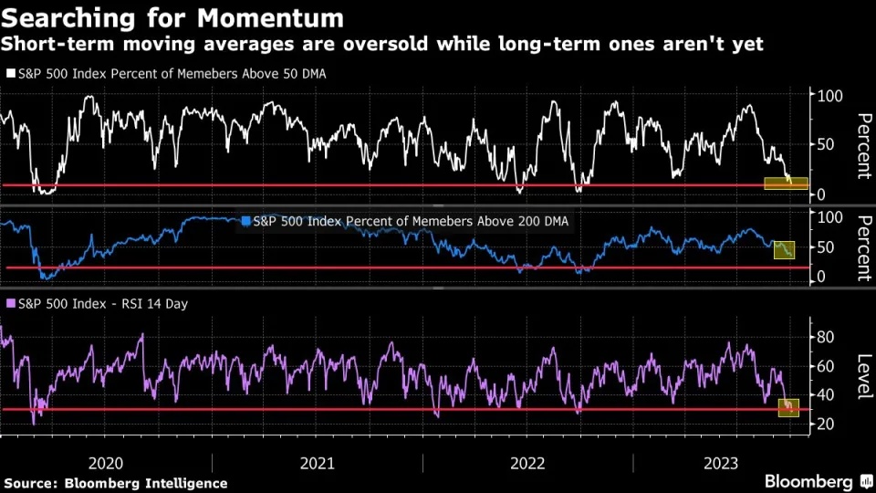 话虽如此,有迹象表明美股股市已经超卖。标普500指数14日相对强弱指数周二跌破关键的30点,这是自2022年9月以来的首次。截至周二收盘,该指数中只有8%的股票高于50日移动均线,这是投资者可能已过度看空的另一个迹象。