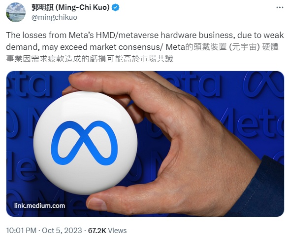 智通财经APP获悉,天风知名分析师郭明錤发文表示,META(META.US)的头戴装置(元宇宙)硬件事业因需求疲软造成的亏损可能高于市场共识。据郭明錤最新调查指出,META的头戴装置/元宇宙硬件出货量持续显著下滑,故缩编头戴装置/元宇宙事业对改善亏损帮助有限。