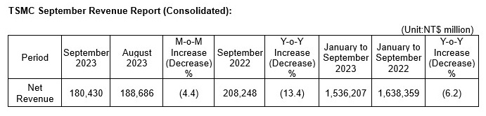 智通财经APP获悉,台积电(TSM.US)周五公布2023年9月营收为1804.3亿元台币,环比降低4.4%,同比下降13%。2023年1月至9月的营收总计15362.1亿新台币,较2022年同期减少6.2%。