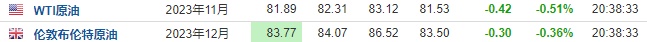 3.截至发稿,WTI原油跌0.51%,报81.89美元/桶。布伦特原油跌0.36%,报83.77美元/桶。