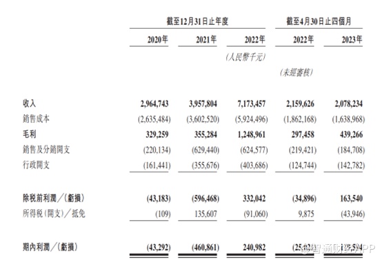 就业绩而言,锅圈食品营收与利润双双录得快速增长。招股书显示,2020-2022年间营收分别为29.6亿元、39.6亿元以及71.7亿元(单位:人民币,下同),毛利润分别为3.3亿元、3.6亿元以及12.5亿元,并于2022年首次实现扭亏为盈,净利润为2.4亿元。2022年扭亏为盈主要为疫情“宅经济”的正面刺激。截至2023年4月30日止,公司实现营业收入20.78亿元,净利润1.19亿元。