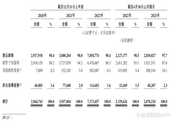 作为严重依赖加盟商的企业,锅圈收入也绝大部分来自于加盟商,不过有所下降,由2020年的98.2%下降至2023年前4个月的87.6%;其他销售渠道收入占比则由2020年的0.2%提升至2023年前4个月的10.1%。不过与加盟收入占比来看,其他销售渠道占比仍旧过低。