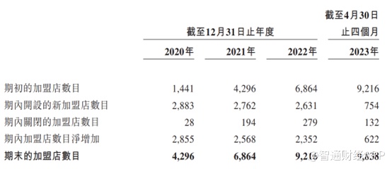 过往公司业绩快速增长也主要得益于加盟店总数的增加。招股书显示,锅圈食品的加盟店总数由截至2020 年1月1日的1441家增至截至2023年4月30日的9838家。2020年至2022年加盟店数每年净增加2000家以上,不过净增加数呈现下降趋势,由2020年的2855家下降至2022年的2352家,截至2023年4月30日,公司加盟店净增加数为622家。