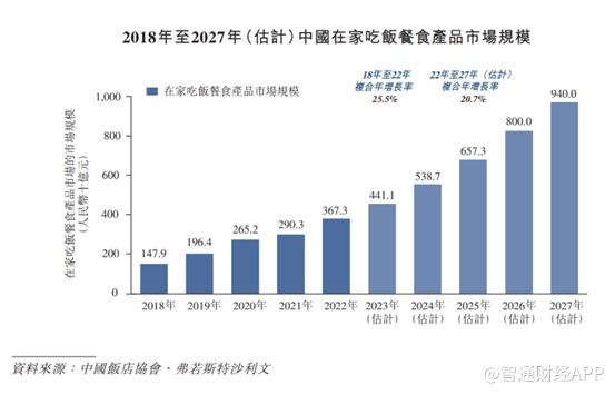 在供需两旺的情况下,根据沙利文报告显示,按零售额计,中国在家吃饭餐食产品市场规模由2018年的1479亿元增长至2022年的3673亿元,复合年增长率为25.5%。预计2027年的市场规模将达到9400亿元,自2022年的复合年增长率为20.7%。