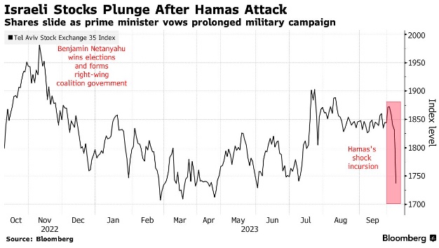 哈马斯在以色列脆弱的时刻发动袭击。内塔尼亚胡削弱司法机构的努力引发了大规模抗议,并使外国投资者感到不安。在彭博追踪的一篮子31种主要货币中,谢克尔已经是今年跌幅最大的货币之一。
