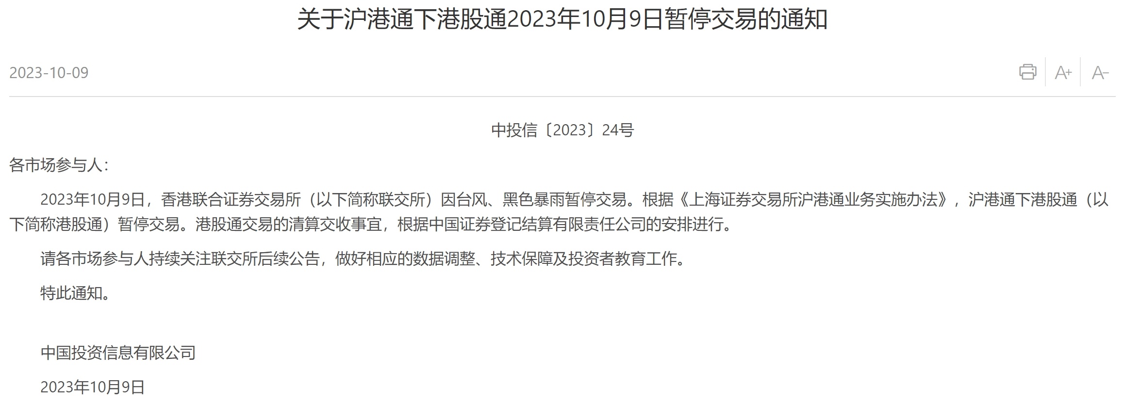 智通财经APP获悉,上交所公告,10月9日,香港联合证券交易所因台风、黑色暴雨暂停交易。根据《上海证券交易所沪港通业务实施办法》,沪港通下港股通暂停交易。港股通交易的清算交收事宜,根据中国证券登记结算有限责任公司的安排进行。