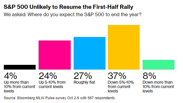 除了借贷成本上升和消费者疲软带来的风险外,标普500指数成份股公司未来12个月的盈利预期接近历史记录高位。大约60%的参与者认为即将公布的财报将推动标普500指数下跌。近37%的人预计今年年底该指数将比目前水平下降5%至10%,8%的人预计降幅会更大。