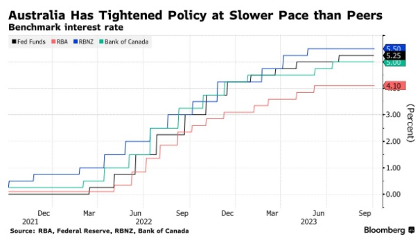 在14个月内将利率上调400个基点至4.1%的“限制性”水平后,澳洲联储在过去的四次会议上暂停了加息。货币市场上的押注暗示,紧缩周期已接近尾声,而经济学家预计还会有一次加息至4.35%。