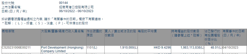 智通财经APP获悉,香港联交所最新资料显示,10月4日,Port Development (Hongkong) Company Limited增持招商局港口(00144)191万股,每股作价9.4296港元,总金额约为1801.05万港元。增持后最新持股数目约为19.83亿股,最新持股比例为48.01%。
