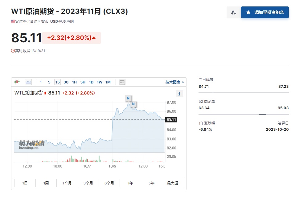 智通财经APP获悉,以色列和巴勒斯坦爆发近20年来最大规模冲突,受该冲突升级影响,避险情绪下原油、黄金大涨。10月9日开盘,国际油价跳涨,WTI开盘价为85.25美元/桶,较前日收盘价上涨2.46美元/桶;布伦特开盘价为86.4美元/桶,较前日收盘价上涨1.82美元/桶。9日早盘,COMEX黄金也大幅攀升,金价上涨逾20美元至1860美元/盎司上方。