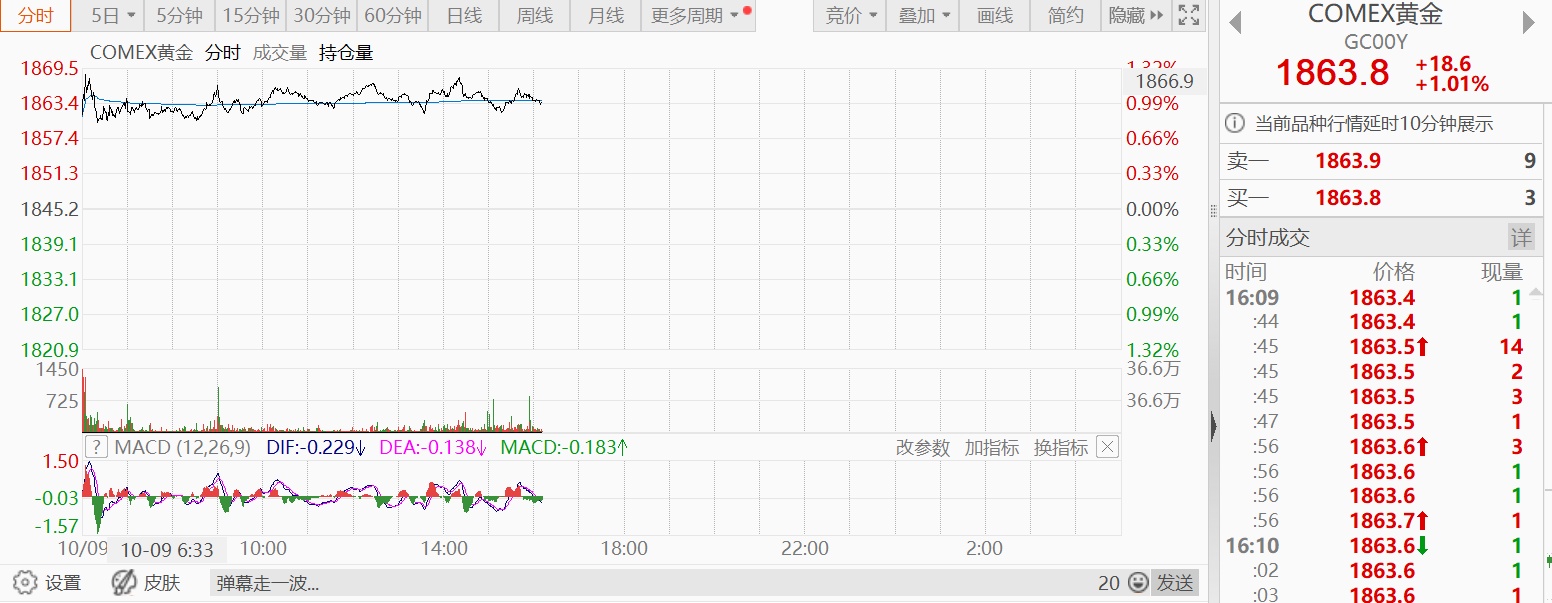 9日截至发稿,WTI原油期货上涨2.80%,报85.11美元/桶;COMEX黄金价格上涨1.01%,报1863.8美元/盎司。