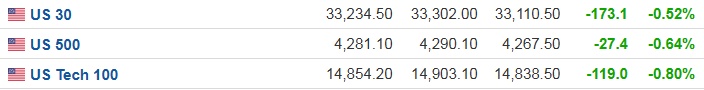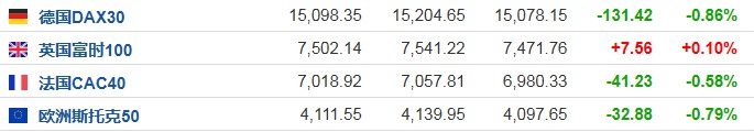 2.截至发稿,德国DAX指数跌0.86%,英国富时100指数涨0.10%,法国CAC40指数跌0.58%,欧洲斯托克50指数跌0.79%。