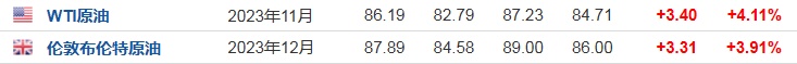 3. 截至发稿,WTI原油涨4.11%,报86.19美元/桶。布伦特原油涨3.91%,报87.89美元/桶。