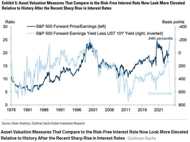 高盛策略师写道:“在金融市场,关键的风险在于,以利率为基准的估值指标现在对一些资产来说更高了,尤其是股票。”“我们估计,如果股票风险溢价降至历史上的第50个百分点,那么接下来一年对GDP增长的影响将达到1%。如果降至全球金融危机前几年的平均水平,其损失将为0.75个百分点。”