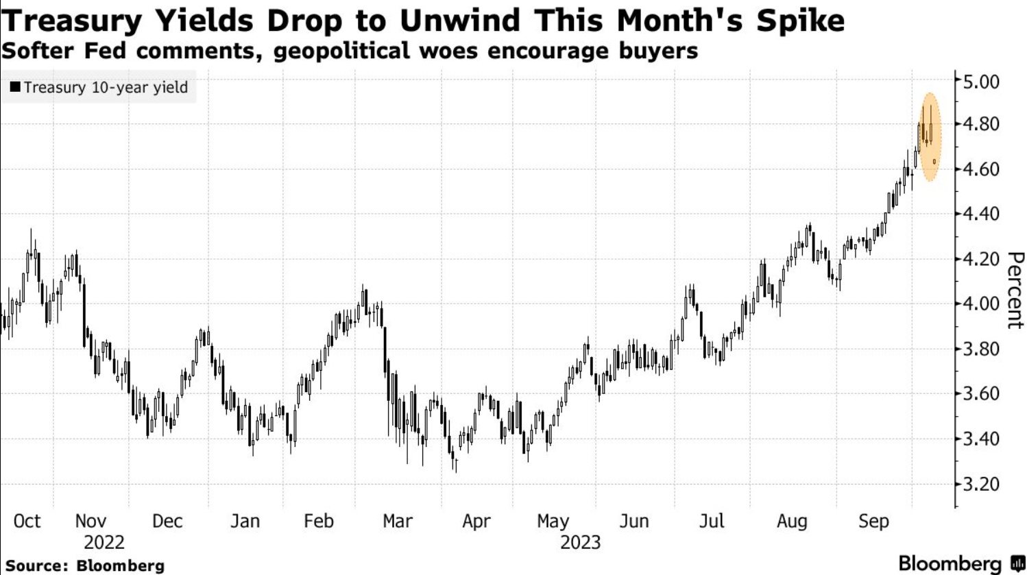 智通财经APP获悉,在美联储官员发表鸽派言论和中东冲突促使人们转向更安全的资产后,美国国债创下3月份以来的最大涨幅。周一美国假期后,其现金市场重新开放,美国10年期国债收益率一度下跌18个基点,至4.62%,美国2年期收益率也下跌了16个基点,至4.93%,投资者加大了对美联储将在2023年底前保持利率不变的押注。