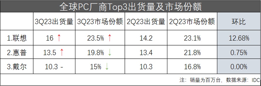 在出货量排名前三的品牌中,联想(00992)以1600万台的成绩位列第一,市场占有率达到了23.5%。并且,其扩大了在全球PC市场的领先地位。