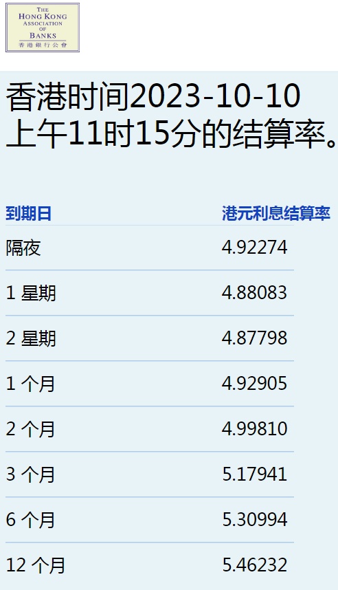 智通财经APP获悉,10月10日,港元拆息几乎全线下跌,仅一年期报升。隔夜息结束三连升,回落59基点至4.92274%,跌破5%水平。一个月及三个月期齐创近一周新低。与楼按相关的一个月拆息中止三连升,报4.92905%。反映银行资金成本的三个月拆息微降至5.17941%,与同期美元LIBOR息差略为扩阔至49基点。六个期报5.30994%。