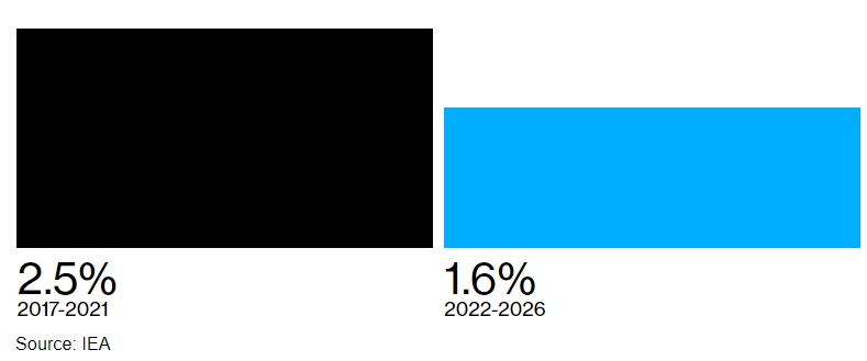 该报告称,尽管去年的历史性能源危机“为全球天然气市场开启了一个不同的时代”,但这种情况仍在发生。欧洲的使用量出现了创纪录的下降,预计2022-2026年全球成熟市场的消费量将每年下降1%。