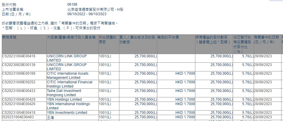 智通财经APP获悉,香港联交所最新资料显示,9月28日,CITIC International Assets Management Limited增持迪信通(06188)2570万股,每股作价1.70港元,总金额为4369万港元。增持后最新持股数目为2570万股,最新持股比例为5.76%。