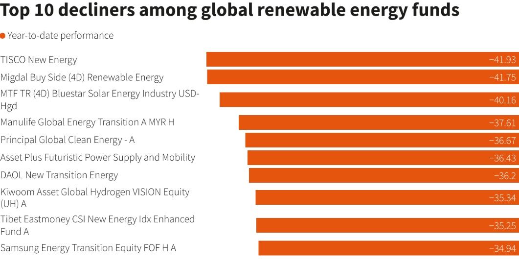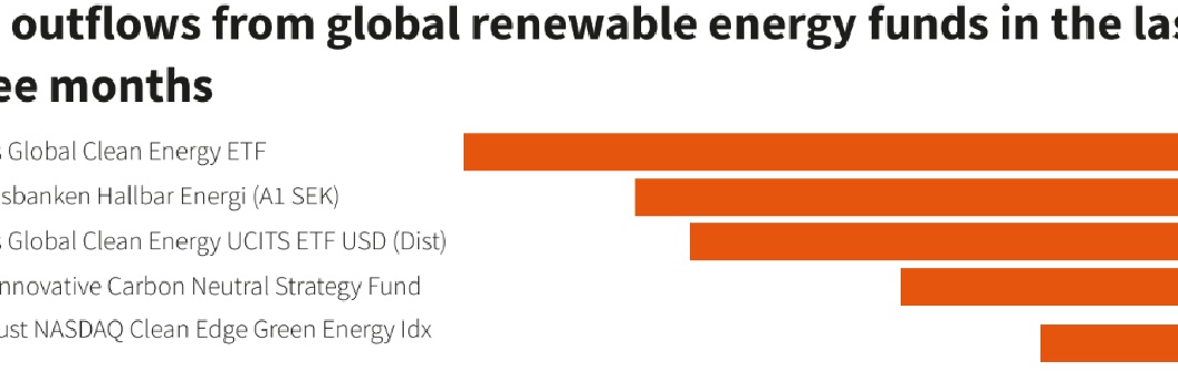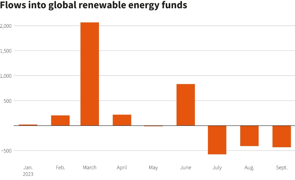 在截至9月底的三个月里,投资者以有记录以来最快的速度抛售可再生能源基金,原因是利率上升和原材料成本飙升挤压了利润率,令清洁能源股遭受打击。根据LSEG Lipper的数据,全球可再生能源基金在第三季度遭遇资金净流出14亿美元,为有史以来最大的季度资金流出。