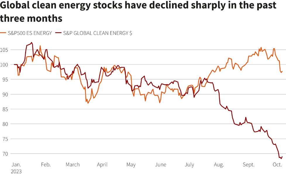 由主要太阳能和风能公司以及其他可再生能源相关企业组成的标普全球清洁能源指数在2023年下跌了30%,跌幅几乎都是自7月份以来形成的。相比之下,以油气为主的标普500能源指数今年小幅上涨。