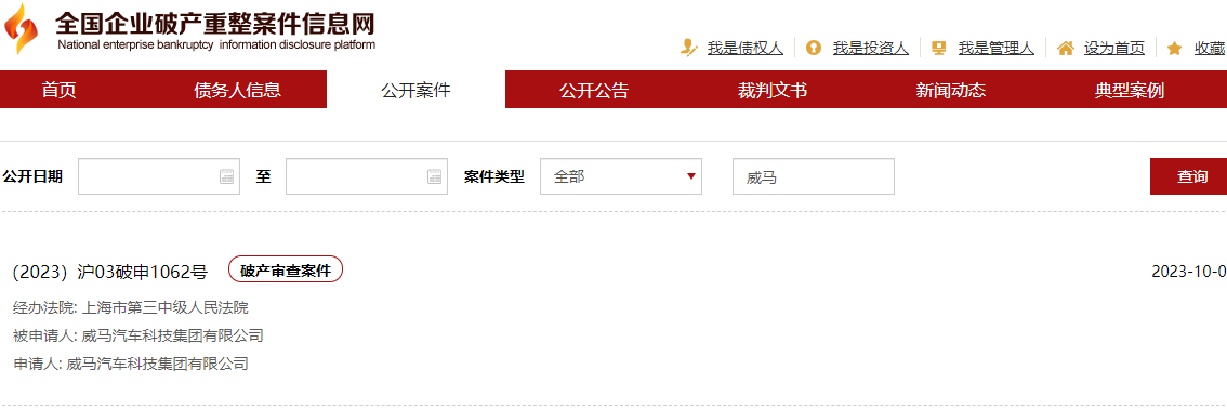 智通财经APP获悉,10月9日,据全国企业破产重整案件信息网显示,威马汽车科技集团有限公司(下称威马汽车)申请破产重整,申请人正是公司自身,经办法院为上海市第三中级人民法院。
