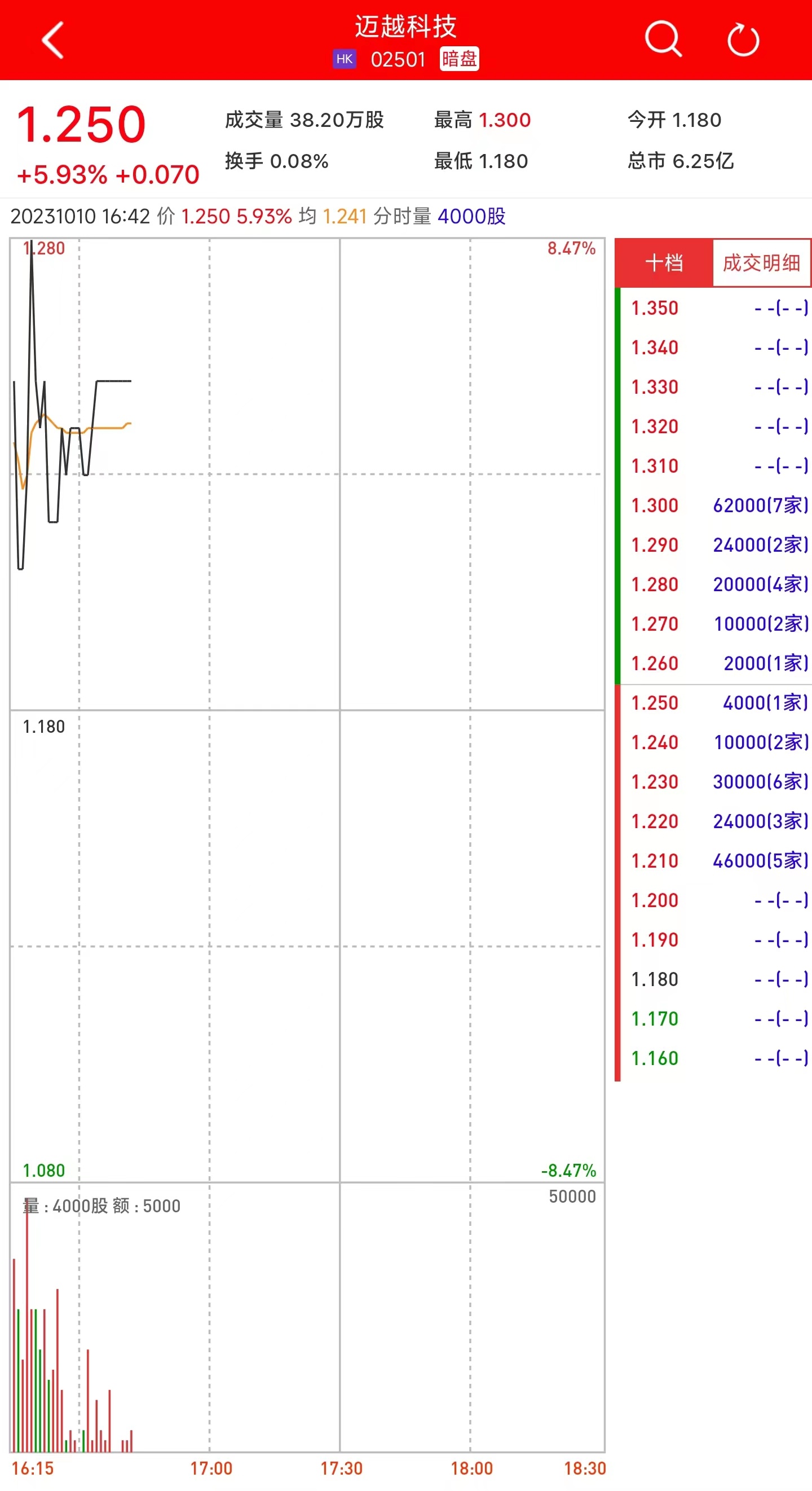 智通财经APP获悉,迈越科技(02501)将于10月11日(周三)在香港挂牌。截至发稿,利弗莫尔证券暗盘交易显示报价1.25港元,较招股价1.18港元涨5.93%。每手2000股,不计手续费,每手赚140港元。