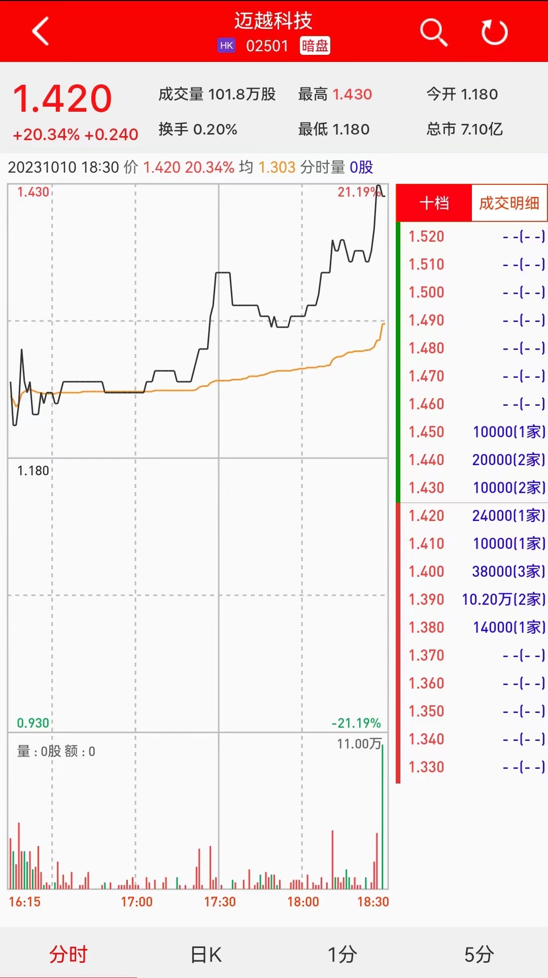 智通财经APP获悉,迈越科技(02501)将于10月11日(周三)在香港挂牌。截至收盘,利弗莫尔证券暗盘交易显示报价1.420港元,较招股价1.180港元涨20.34%。每手2000股,不计手续费,每手赚480港元。