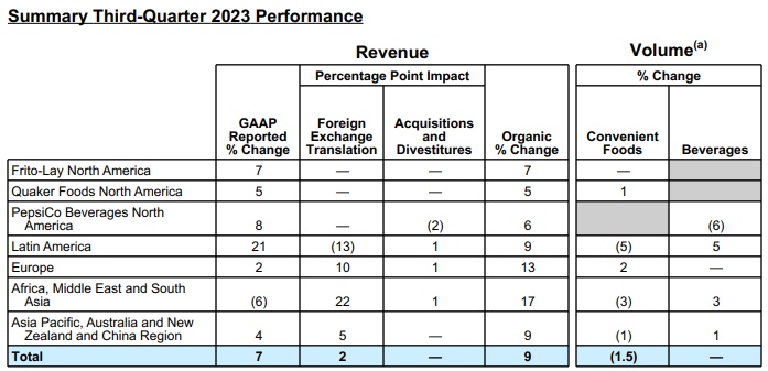 第三季度有机销售额同比增长8.8%,超过了市场普遍预期的增长8.3%。本季度,欧洲(+13%)、非洲/中东和南亚(+17%)地区销售的强劲增长引领了有机销售额的增长。但该公司剔除定价和汇率变化后的销量本季度再次下滑。百事为缓解通货膨胀而提高价格的做法削弱了对其产品的需求。价格再次推动了本季度的销售额增长,饮料业务的销量持平,方便食品业务的销量下降了1.5%。