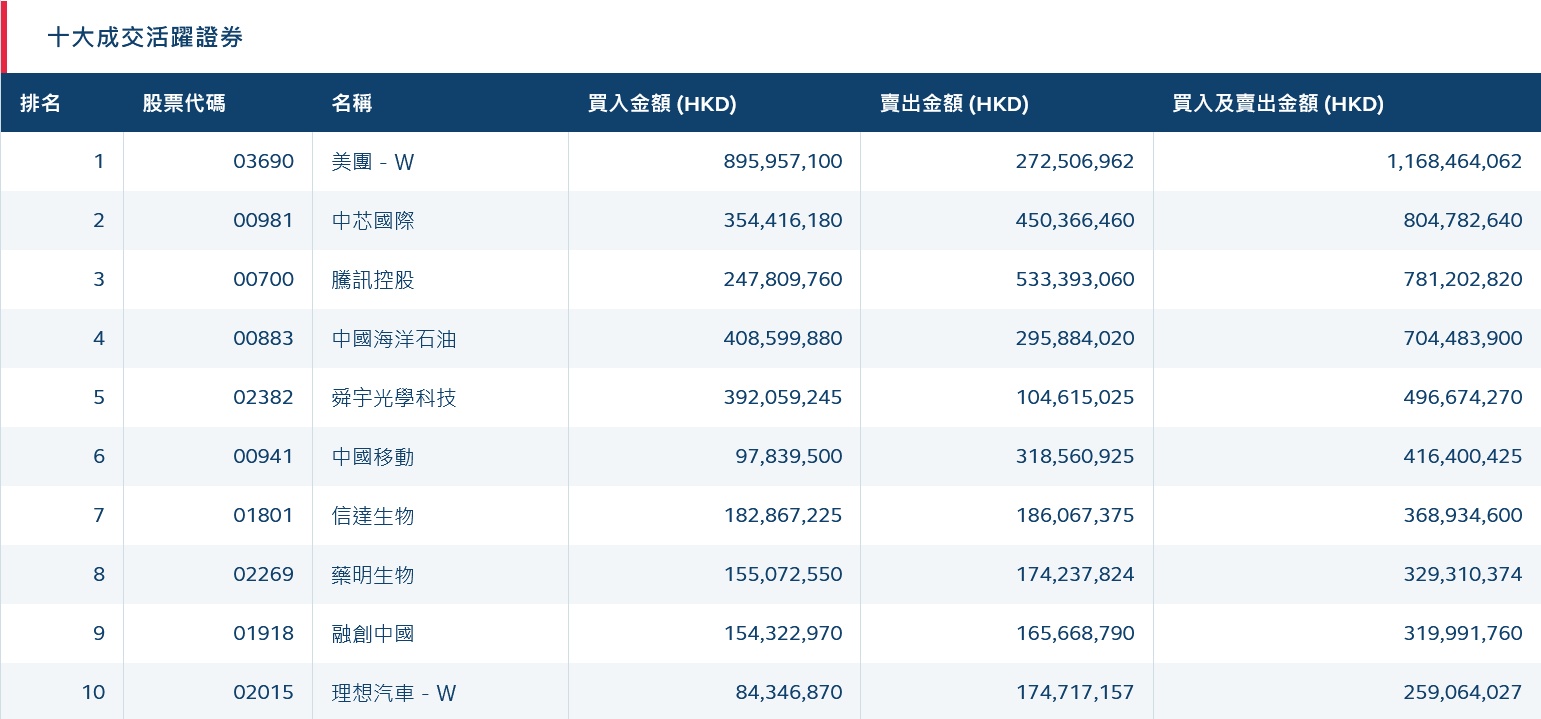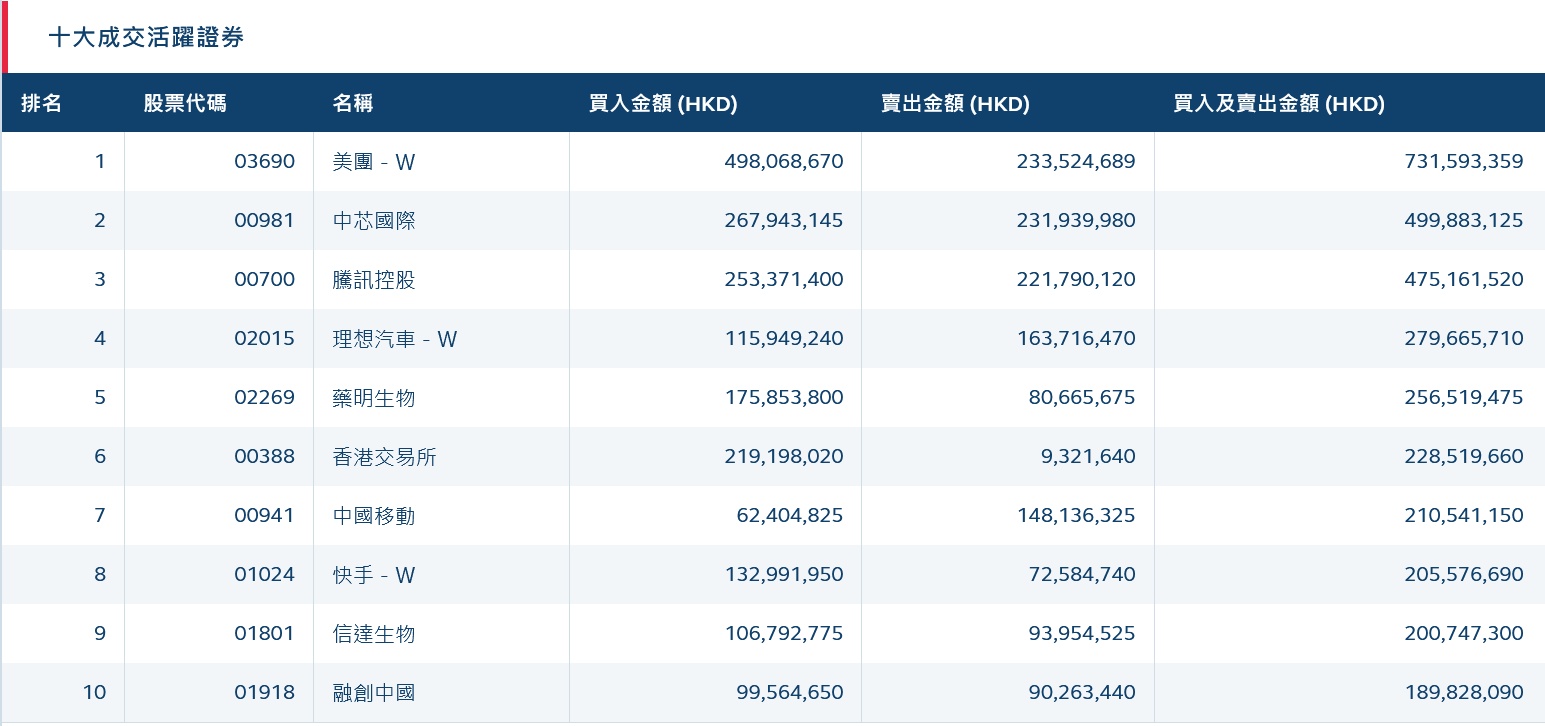 美团-W(03690)获净买入8.87亿港元。消息面上,交银国际表示,外卖场景持续多元趋势,异地订单表现优异。美团餐饮堂食增速远高于行业平均。验证了该行估算的餐饮消费在旅游支出中的占比提升,另一方面,美团在到店业务运营上仍领先行业,拉动客流及消费规模,与该行目前估算的美团到店GMV增速基本一致。招银国际表示,内地本地生活商品交易总额(GMV)在假期期间维持强劲增长趋势,主因强劲的线下流量及美团与其竞争对手进一步提高线上渗透率所做的投入。